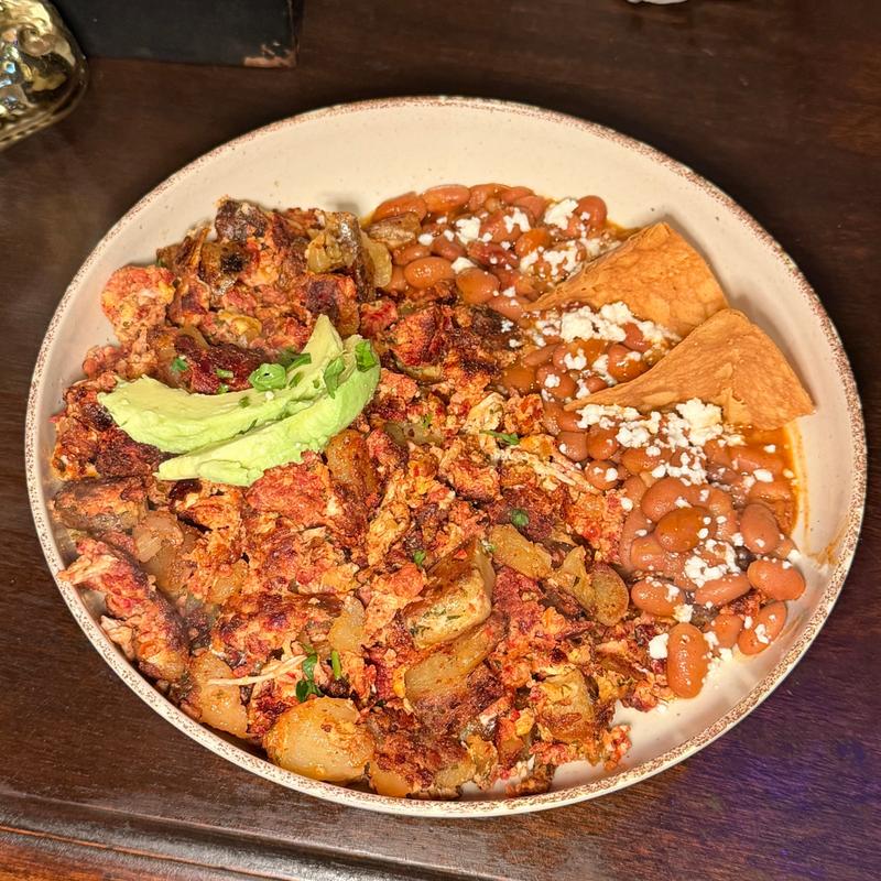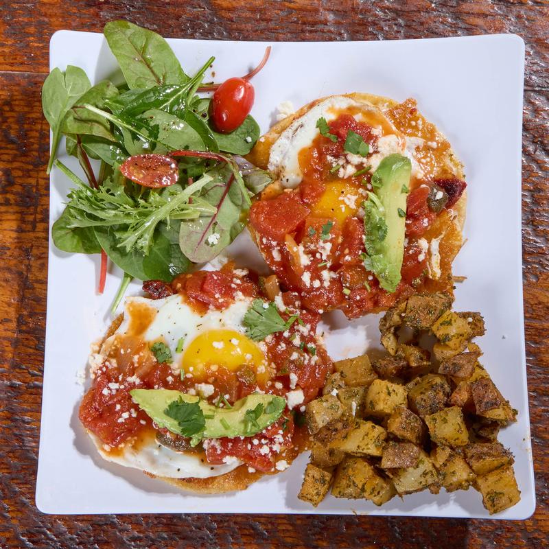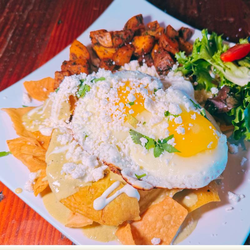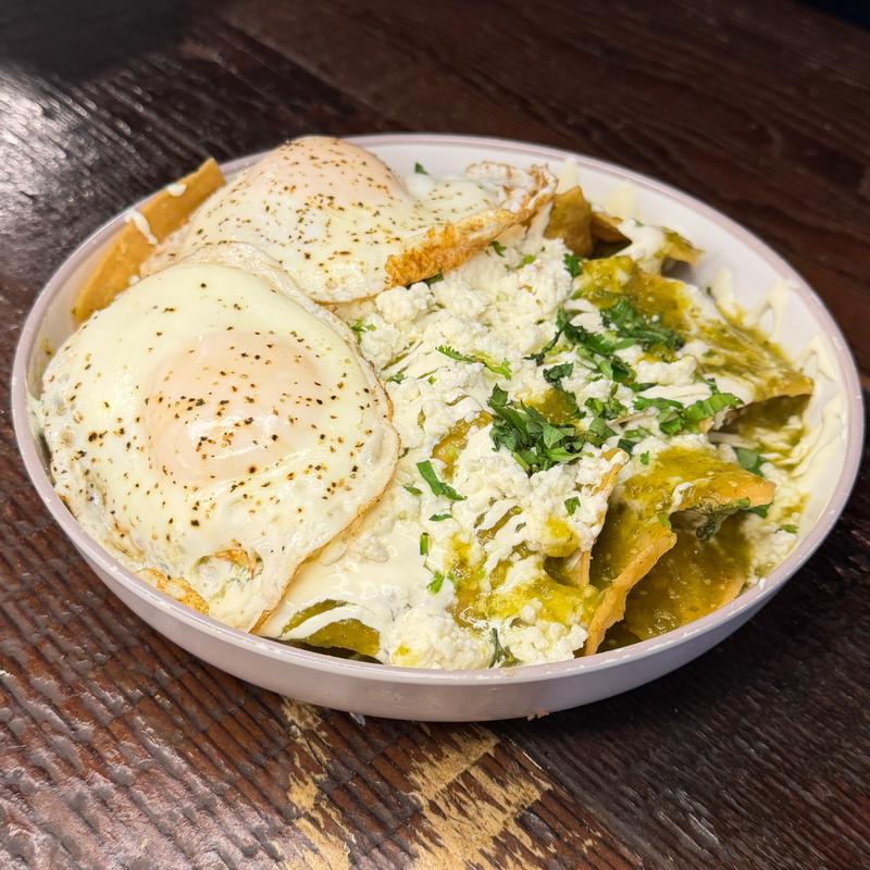 Crisp tortilla wedges topped with two fried eggs, finished with your choice of verde, maya, poblano, or mole sauce, sour cream, queso fresco, and cilantro.