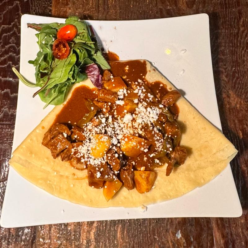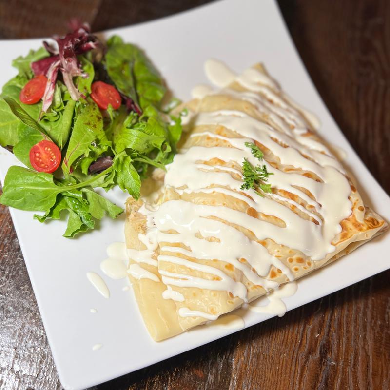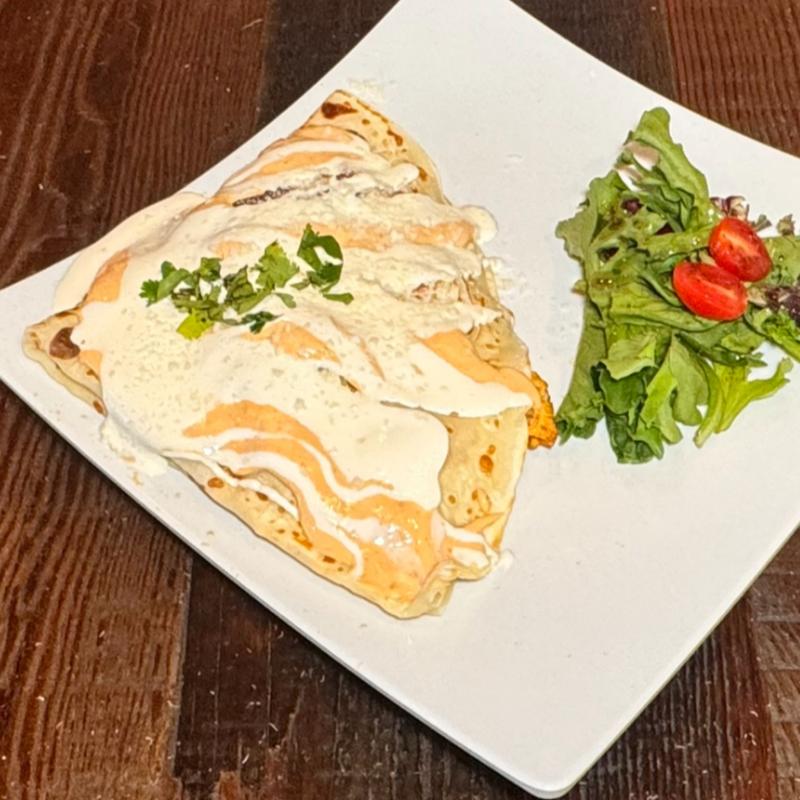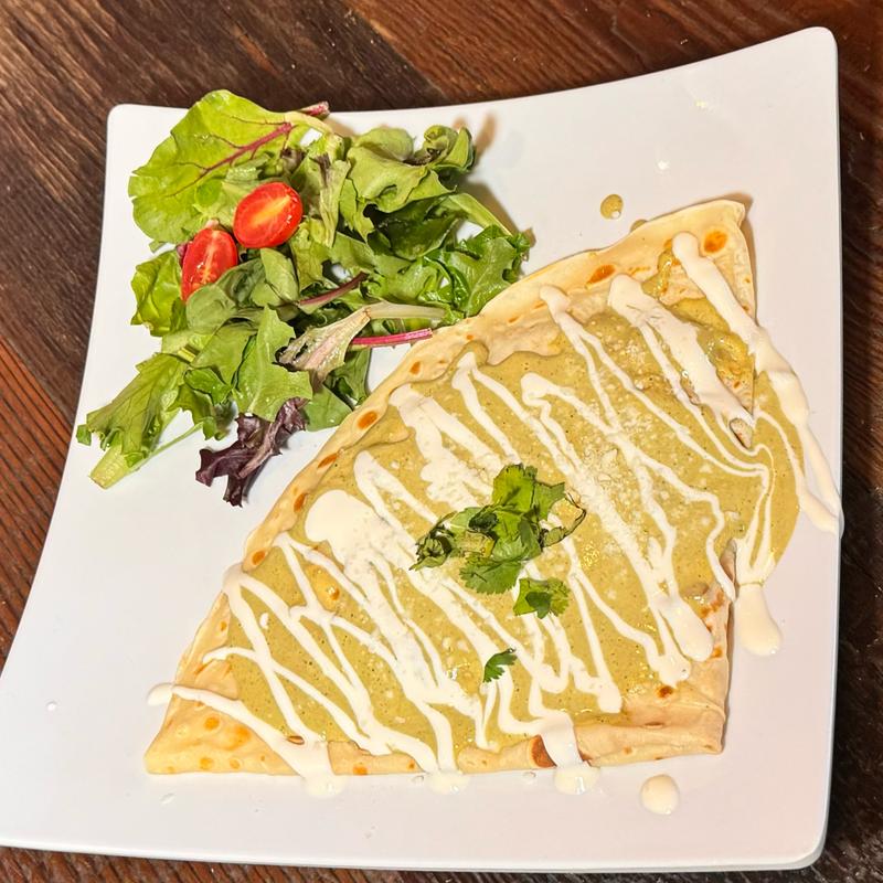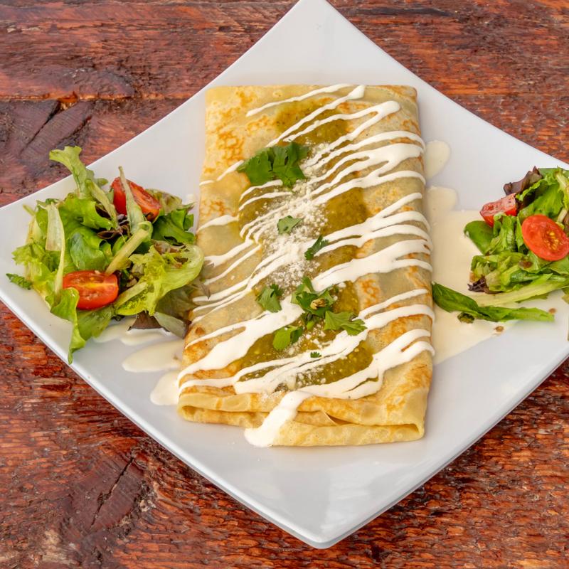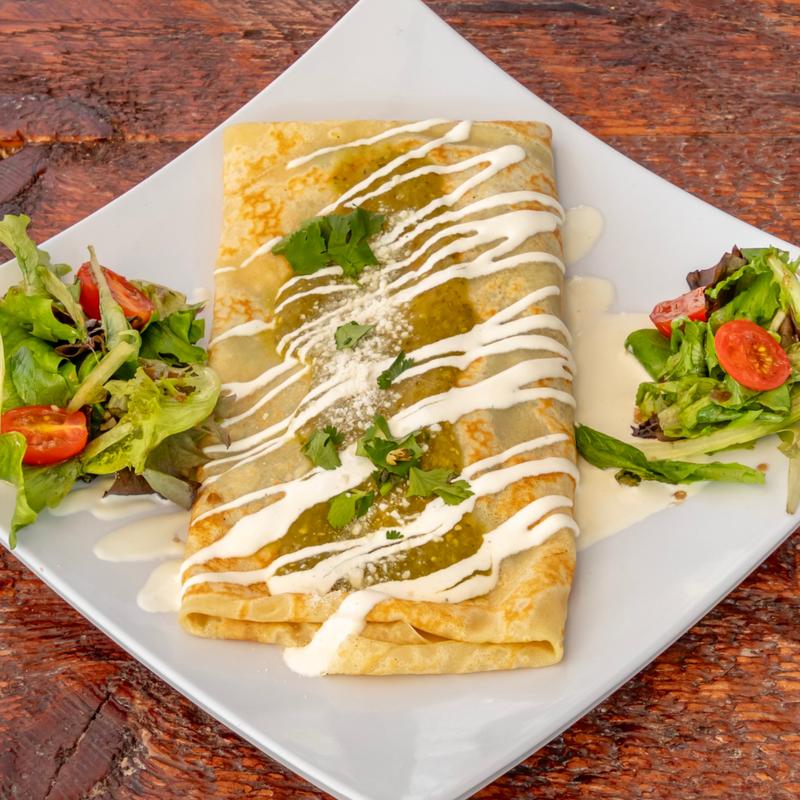 Savory crepe packed with rajas of poblano peppers, onion, corn, and Monterrey cheese, then covered with poblano sauce, sour cream, cilantro, and cotija cheese.