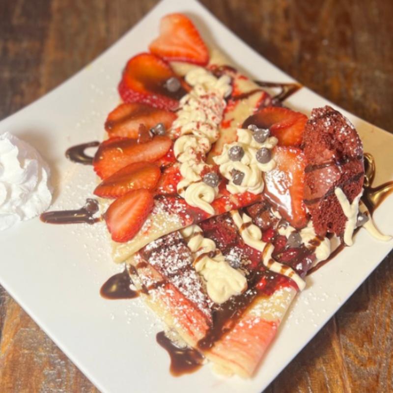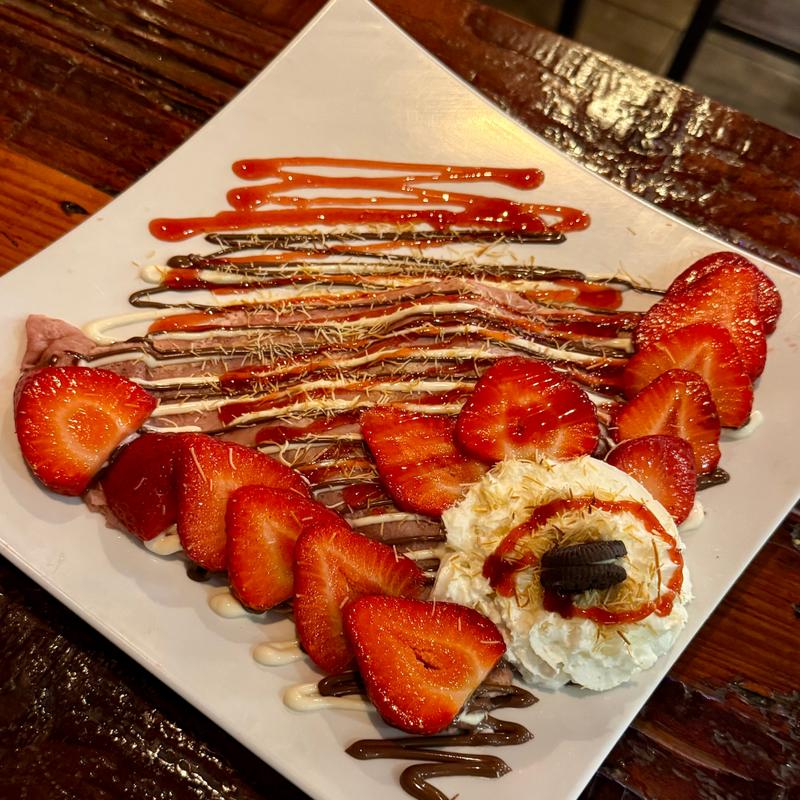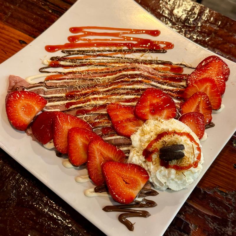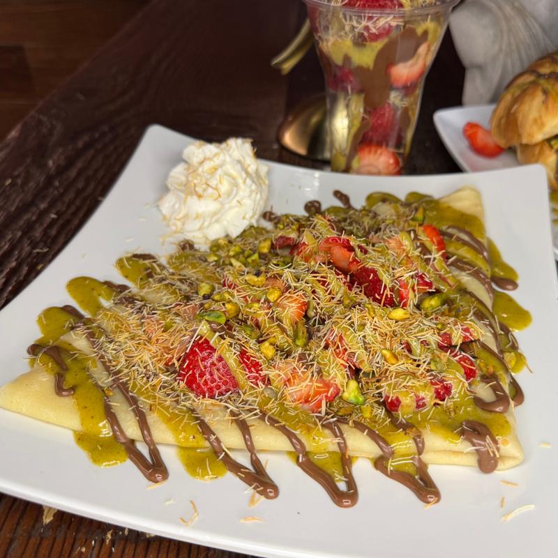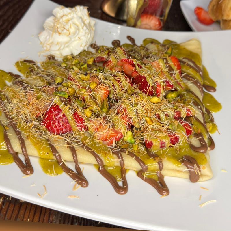Crepe filled with strawberry Nutella and pistachio cream, topped with katifi and toasted pistachios, served with whipped cream on the side.