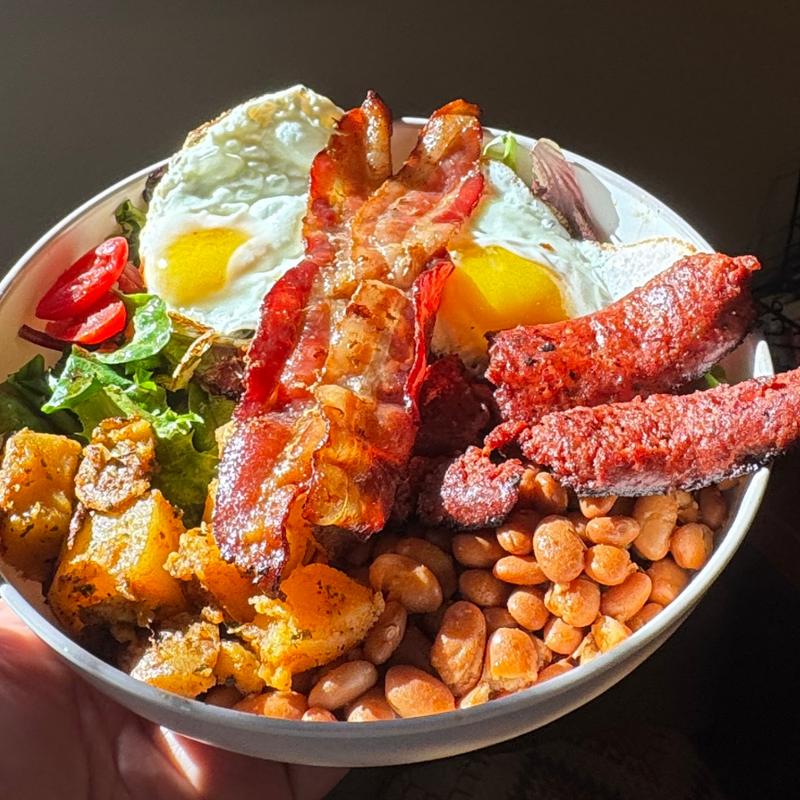 Best breakfast ever! A hearty mix of two eggs, bacon, mild sausage, home potatoes, pinto beans, and a green salad topped with vinaigrette.