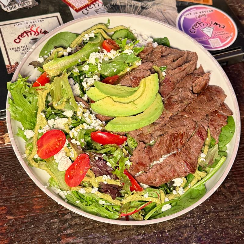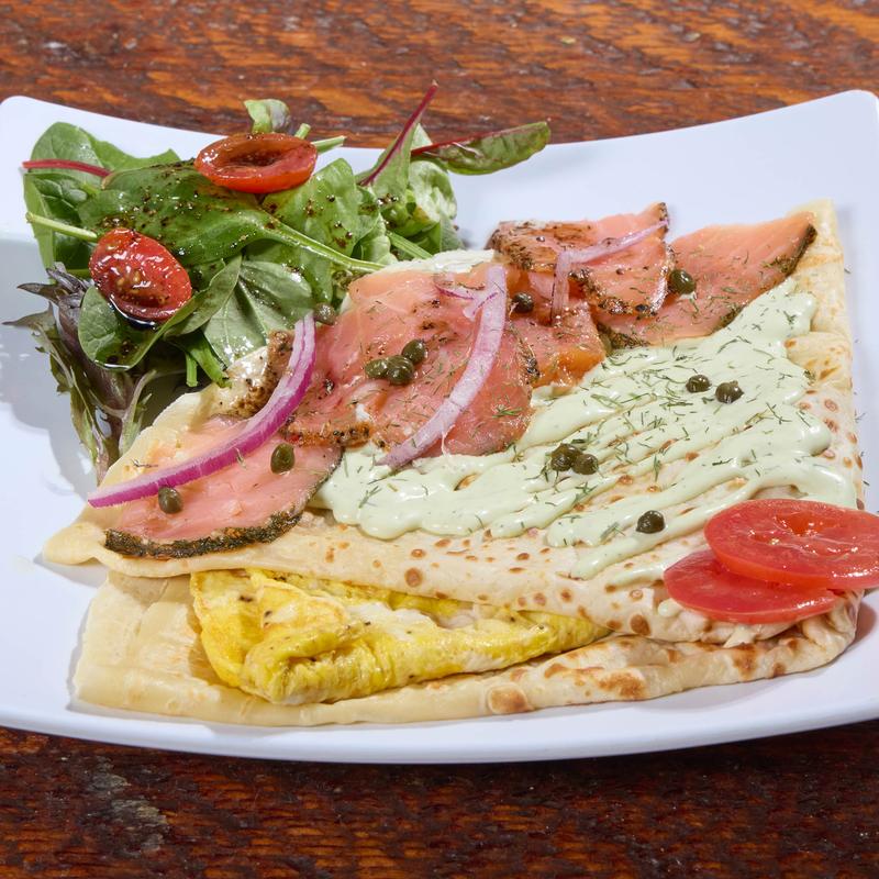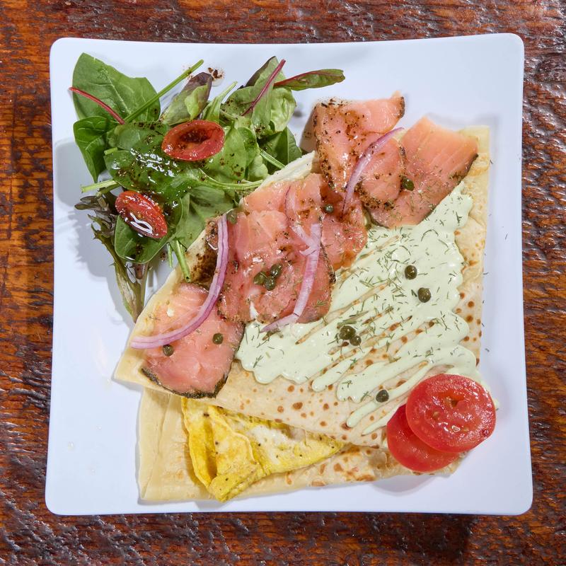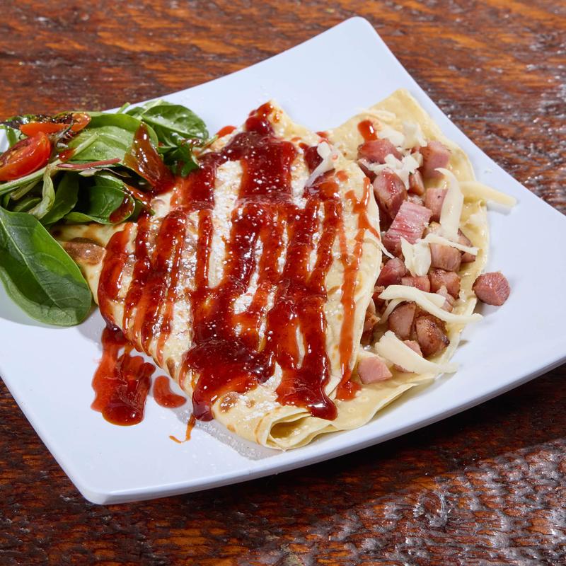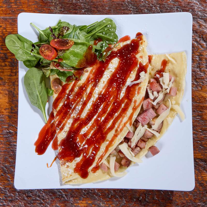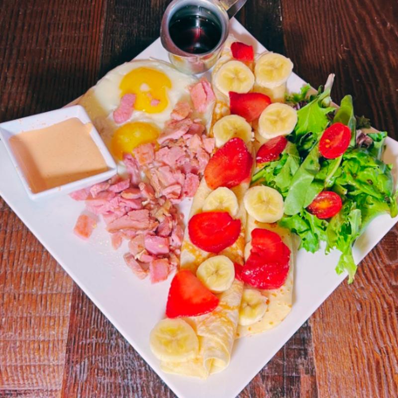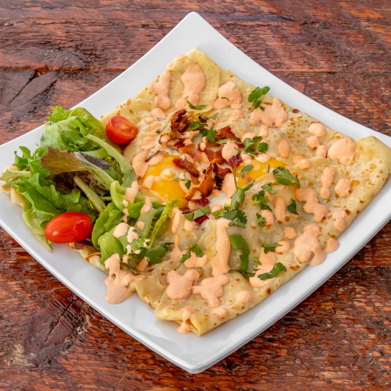 Three eggs cooked your way, one protein of your choice, plus home potatoes and green salad. Comes with a medium sweet crepe.