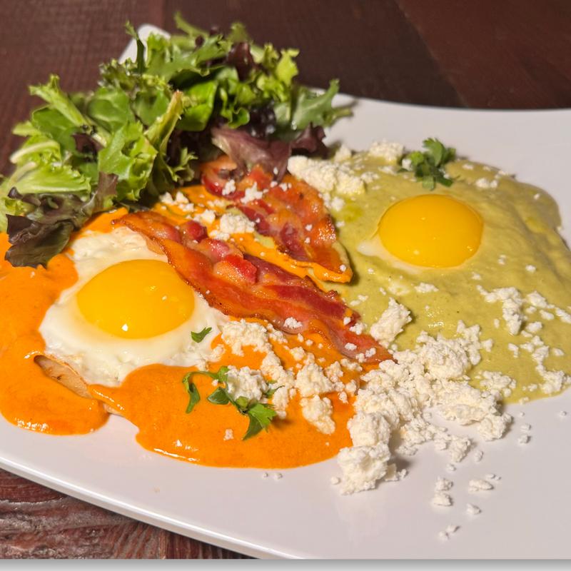 Two fried eggs with Maya and Poblano sauce, topped with queso fresco and served with a green salad and bacon.