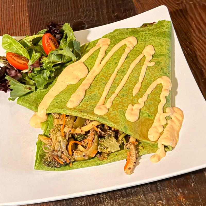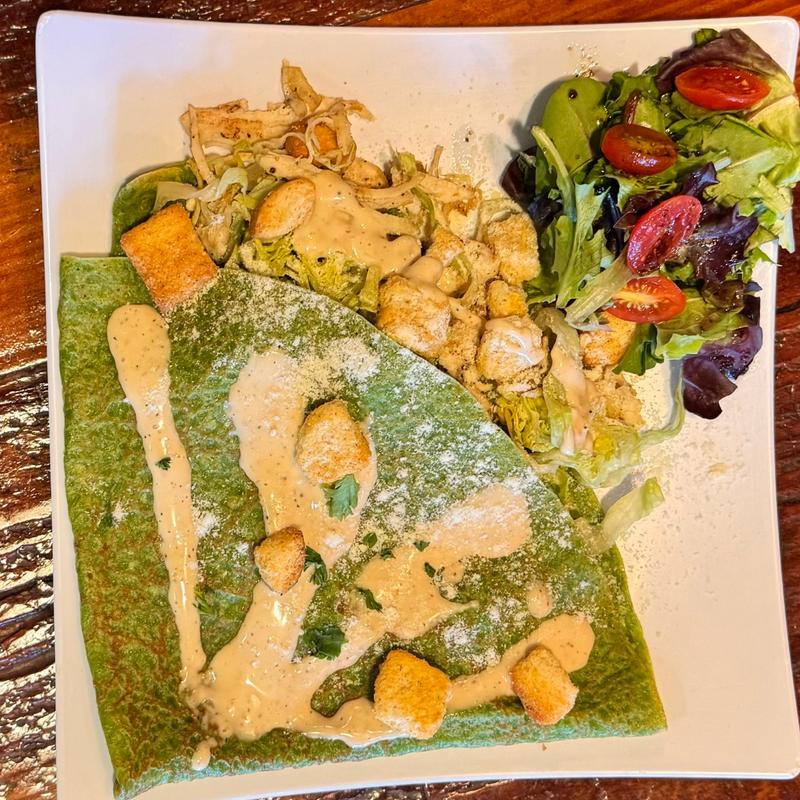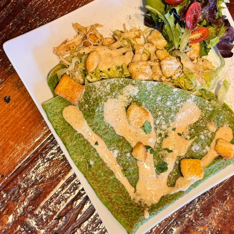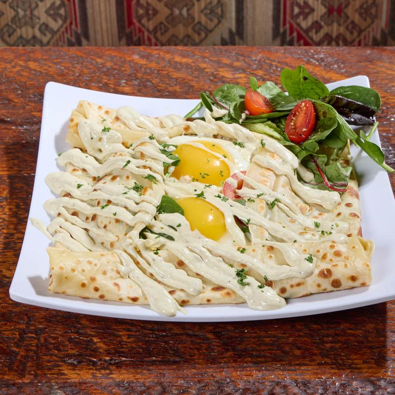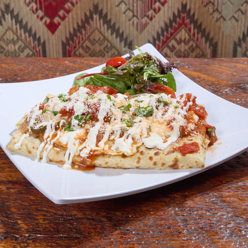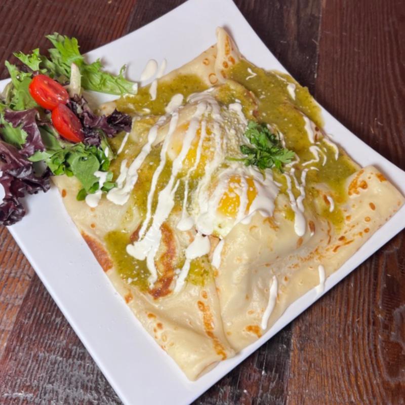 Savory crepe packed with rajas of poblano peppers, onion, corn, and Monterrey cheese, then covered with poblano sauce, sour cream, cilantro, and cotija cheese. Add Eggs or Chicken for +$3.75