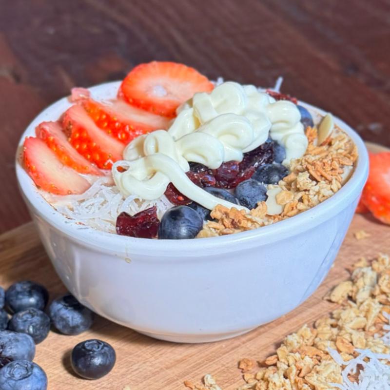 Creamy oatmeal with coconut, mixed berries, banana, and granola, finished with warm or cold milk.