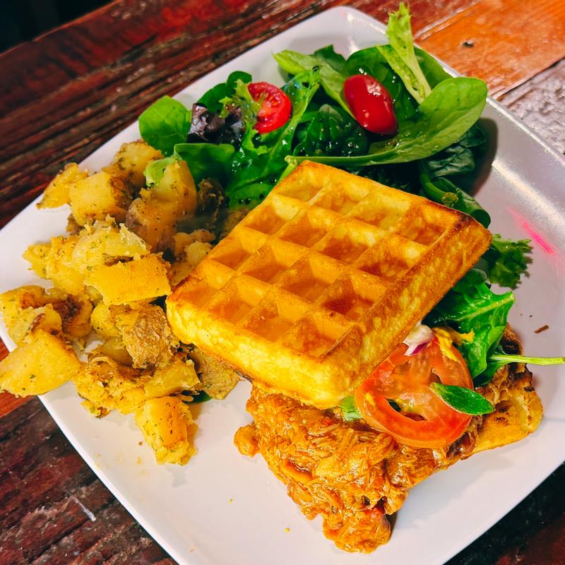 Waffles with eggs, bacon, lettuce, tomato, chipotle sauce, and mozzarella.