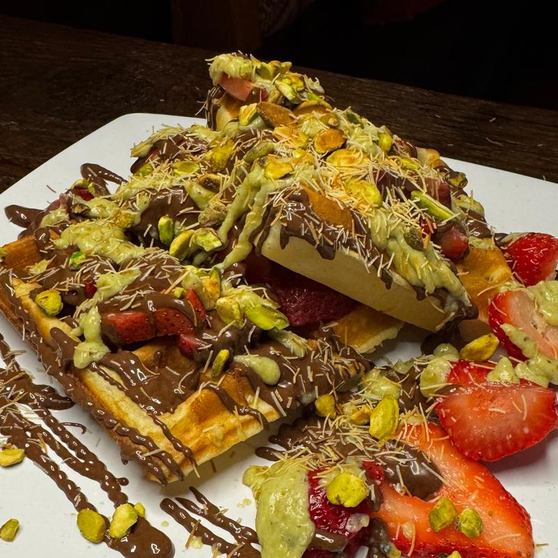 Two warm waffles layered with strawberry and pistachio cream, finished with kataifi, toasted pistachios, and a side of whipped cream.