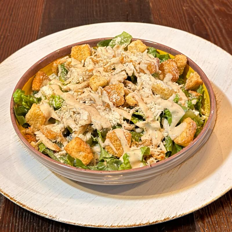 Chicken and crisp lettuce in creamy Caesar dressing with croutons, plus a final layer of dressing, croutons, and parmesan.