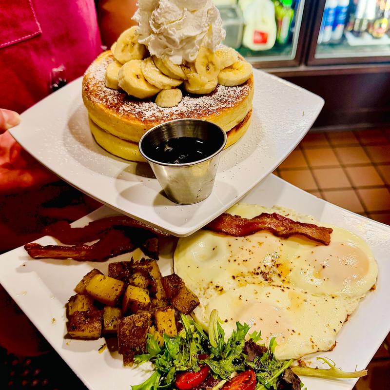 2 Pancakes topped with powder sugar and whipped cream, 2 eggs any style, 2 bacon strips and side of home potatoes.