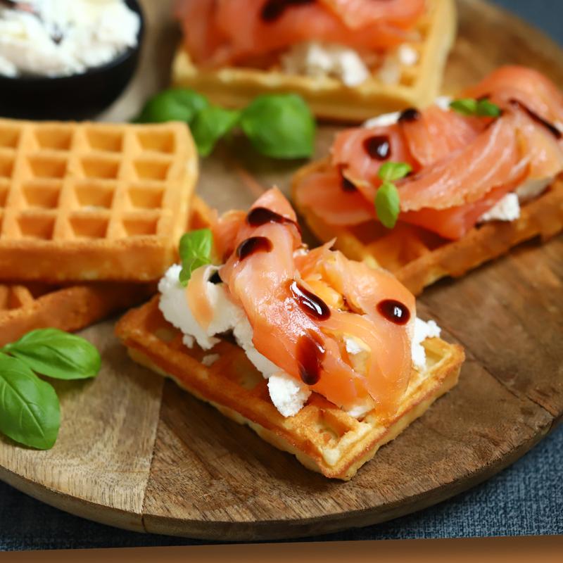Waffle topped with smoked salmon, smooth cream cheese, a touch of balsamic, and a side of mixed greens.