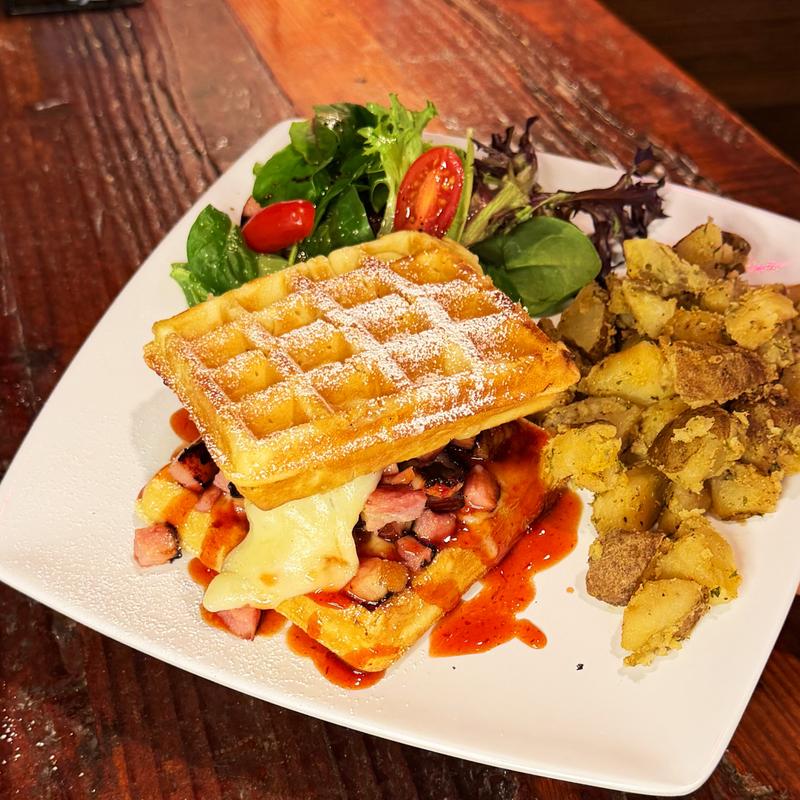 Waffle sandwich with Swiss cheese, ham and sweet strawberry Montecristo sauce.