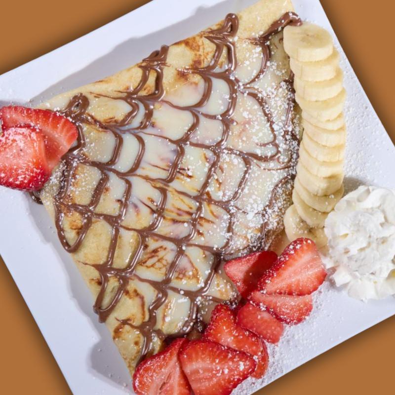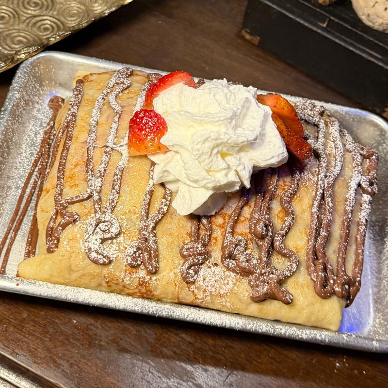 A giant burrito-style crepe packed with Nutella, banana, strawberry, ice cream, and churros dusted in sugar and cinnamon, finished with Nutella and powdered sugar.