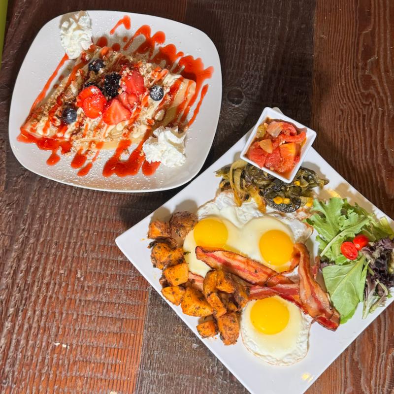 Two rolled crepes with fruit, three eggs any style, one protein choice (bacon, ham, sausage, or chorizo), plus home potatoes potatoes and and a green salad.