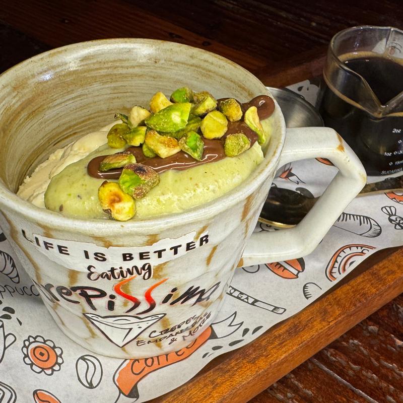 Rich espresso poured over vanilla ice cream with Nutella, pistachio cream, crunchy katifi, and toasted pistachios.