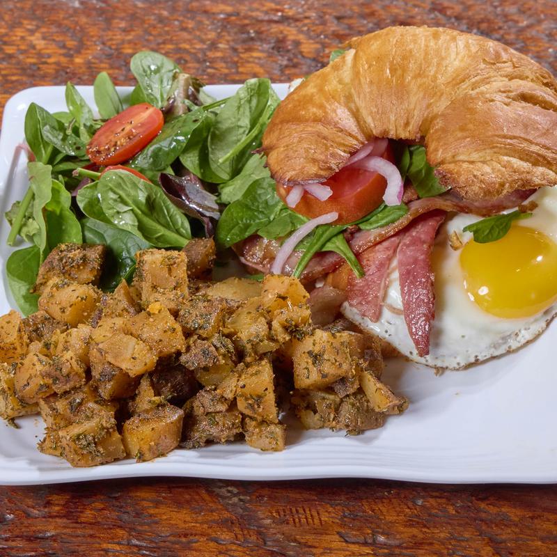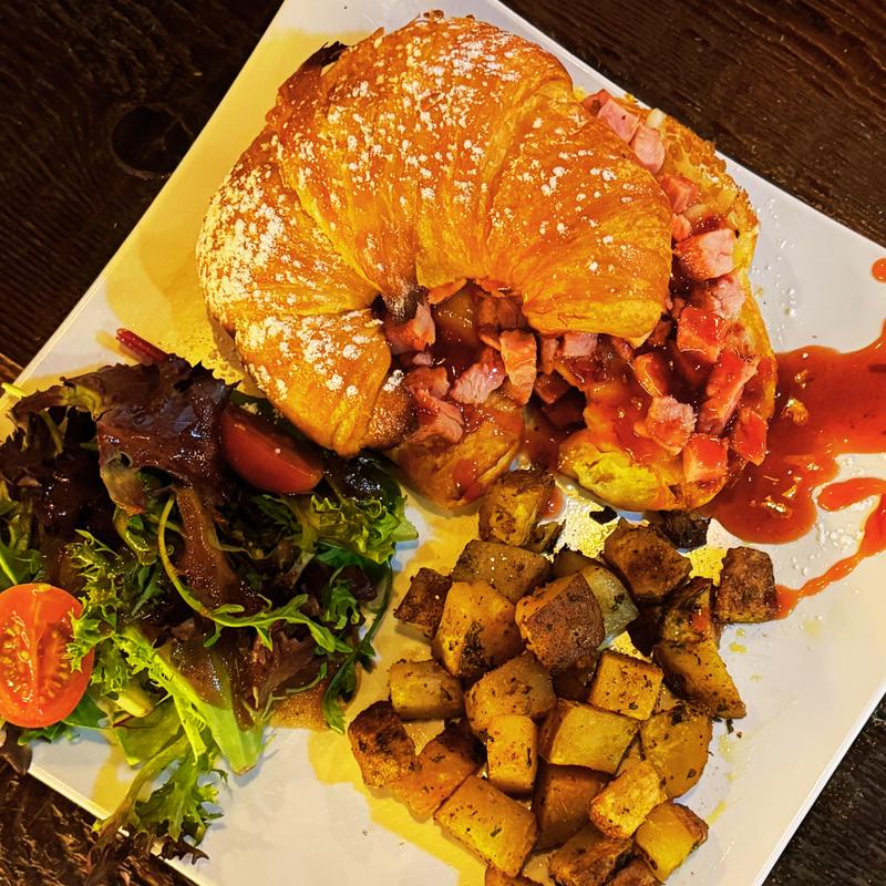 Two smashed croissant French toasts with fruit, three eggs any style, one protein of your choice, plus home potatoes and a green salad.