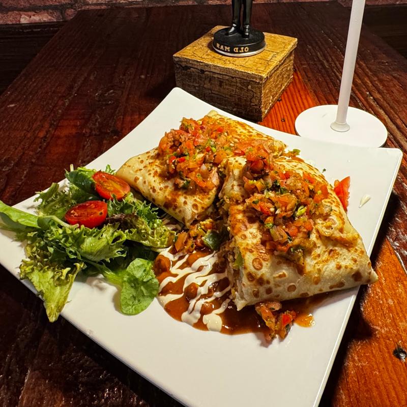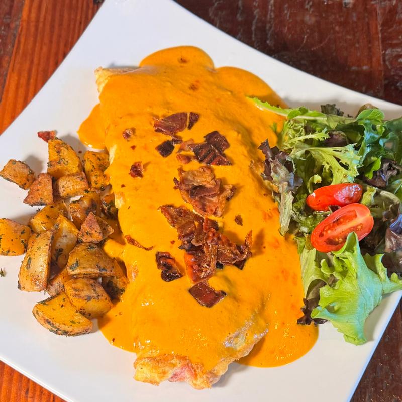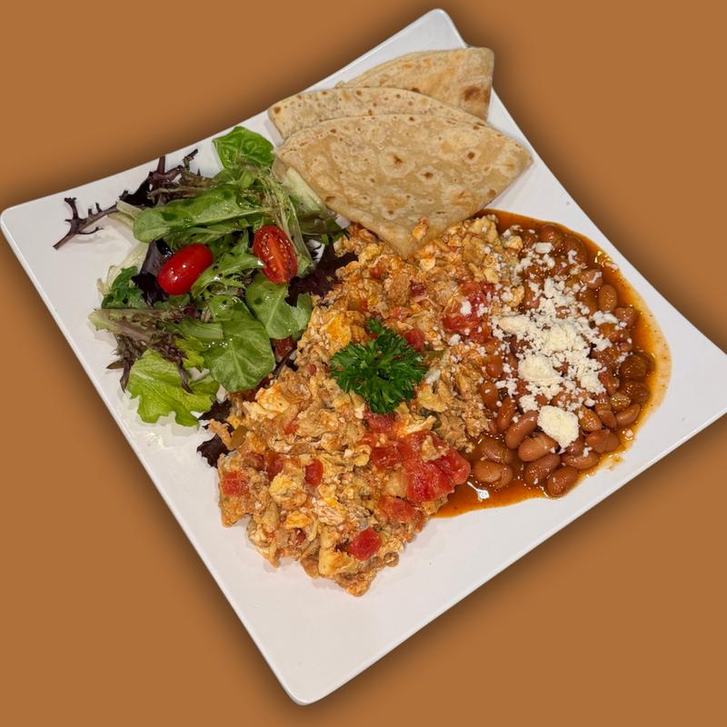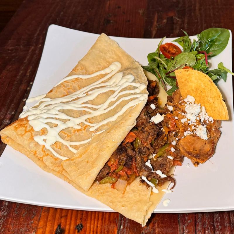 Crepe wrap filled with scrambled eggs, potatoes, pepper, ham, tomato, onion, and cheese, finished with cilantro lime sauce. Served with pinto beans and a fresh mix salad.