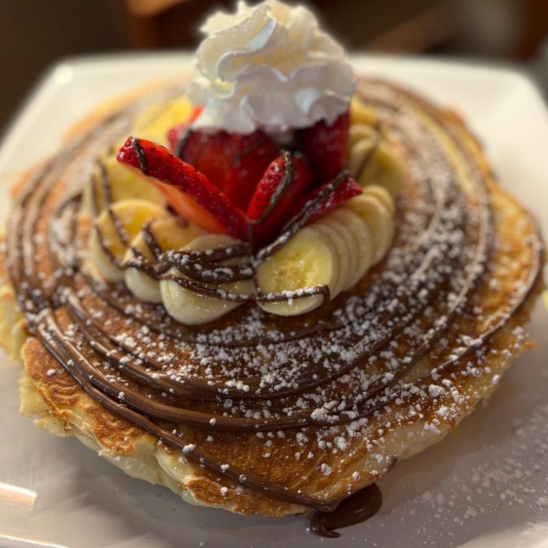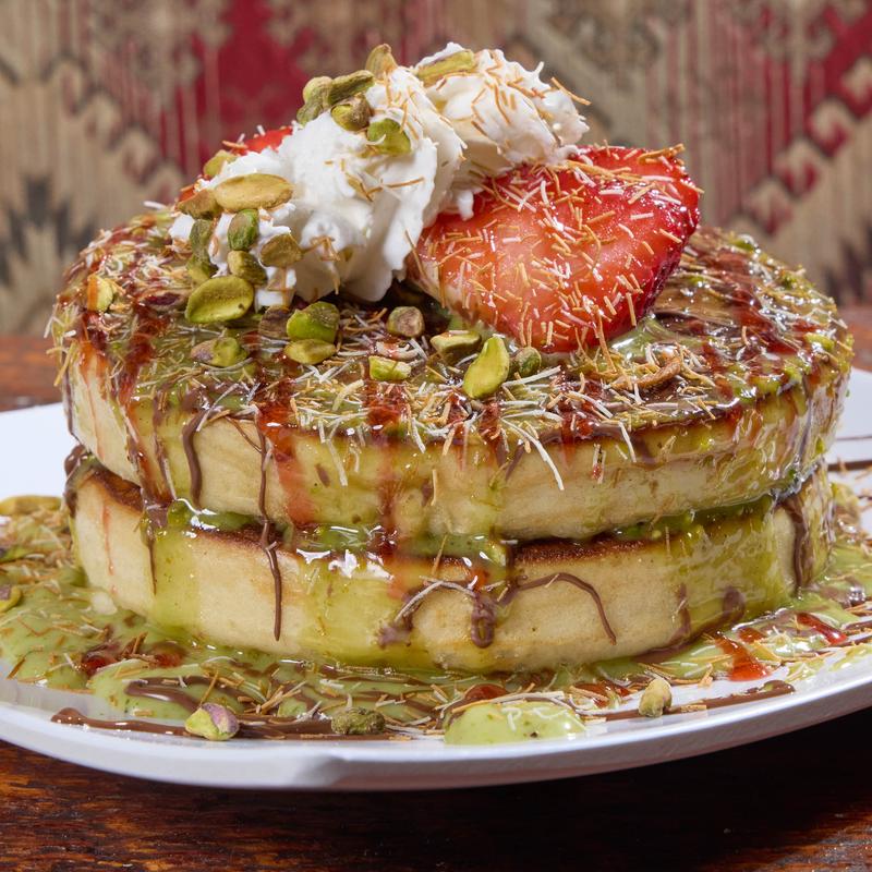 Three pancakes layered with strawberry Nutella and pistachio cream, finished with katifi and toasted pistachios. Served with whipped cream.