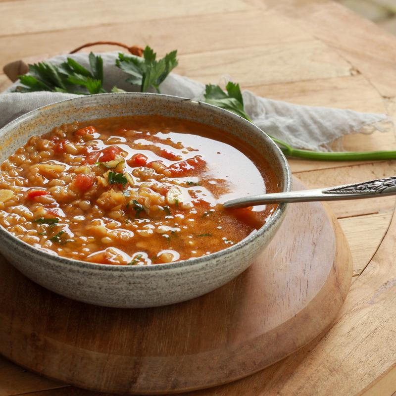 Delicious homemade lentil soup with ingredients like potato, peas, carrots, corn, cilantro, tomato, onion, and non-spicy jalapeño topped with small croissants.