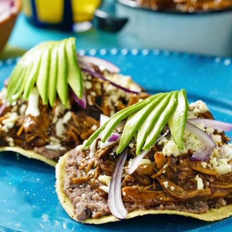 Two fresh tostadas loaded with cooked mole chicken, queso fresco, finished with sour cream and avocado.