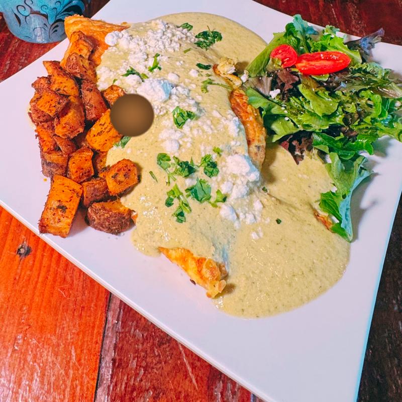 Crispy corn tortilla chilaquiles with creamy poblano sauce, queso fresco, two fried eggs, home potatoes, and a fresh green salad.