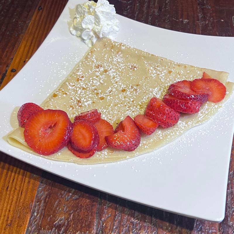Plain crepe with banana, strawberry, or both, finished with a light dusting of powdered sugar.