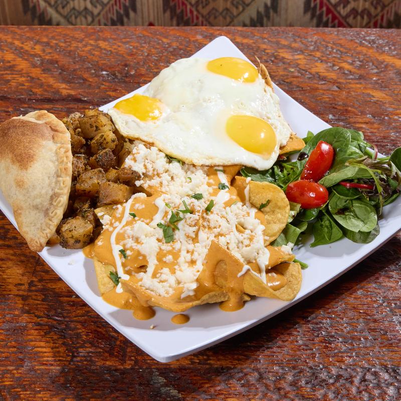 Crispy corn chilaquiles with three fried eggs, our Original Salsa Maya, sour cream, queso fresco, plus one empanada in your favorite flavor.