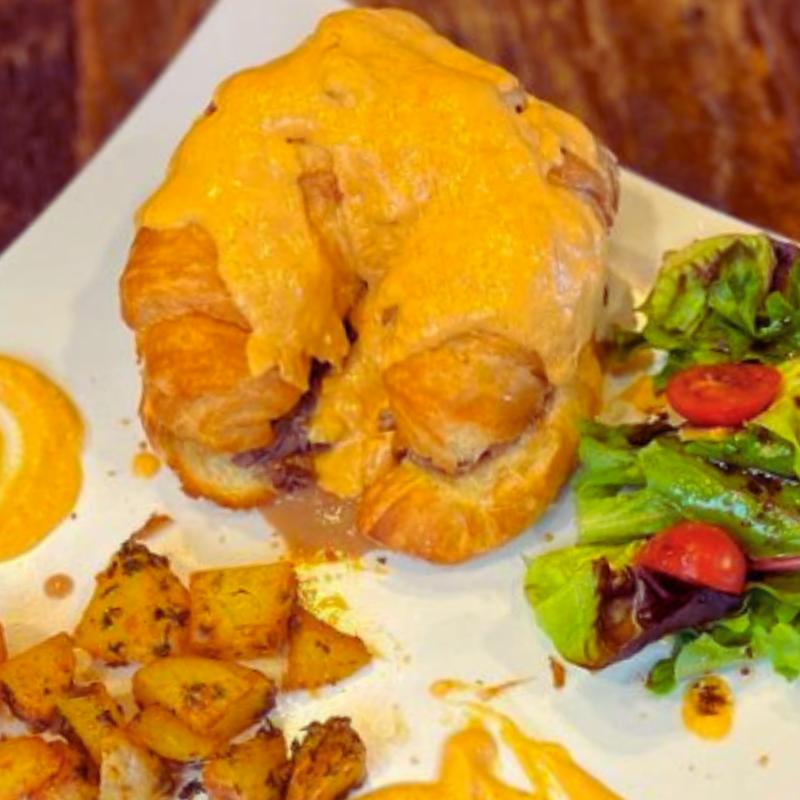 Delicious toast croissant crushed with mozzarella, Swiss cheese, cheddar & turkey ham.