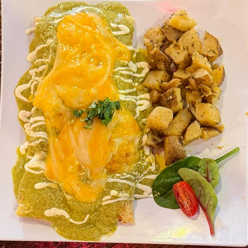 Homemade corn tortillas layered with Monterey cheese, chorizo, egg, ranchera sauce, queso fresco, and avocado. Paired with homemade potatoes and a crisp green salad.