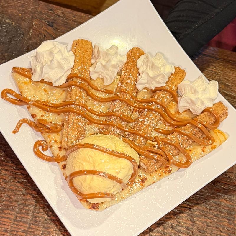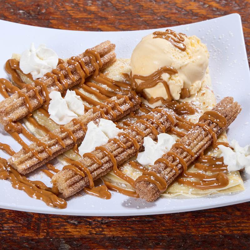 Smooth dulce de leche served with vanilla ice cream and crispy churros.