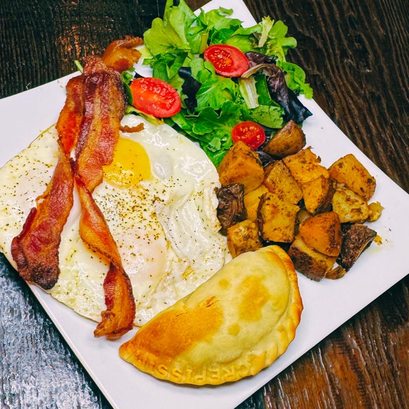 Pick any empanada, enjoy 3 eggs your way, choose a protein, and get home potatoes with a fresh green salad.