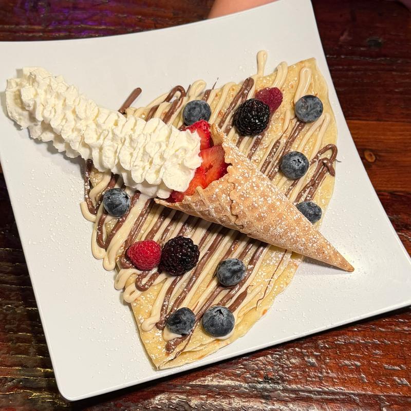 Crispy waffle cone with crème brûlée cream, berries, Nutella, and a drizzle of vanilla sauce.