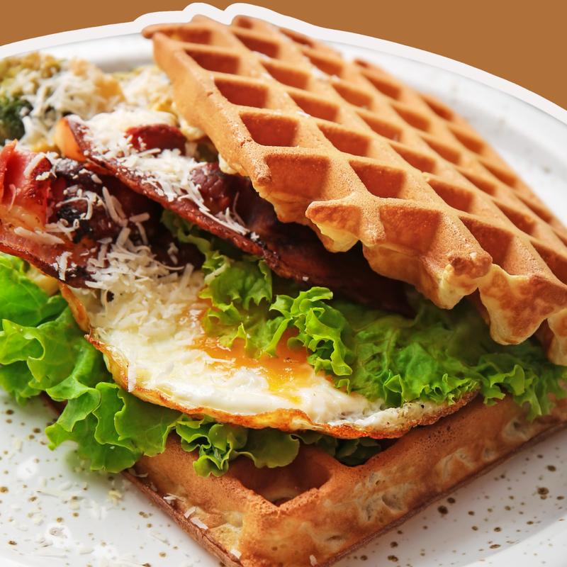 Two eggs with bacon or ham, creamy cheddar, and fresh mixed lettuce on a waffle sandwich.