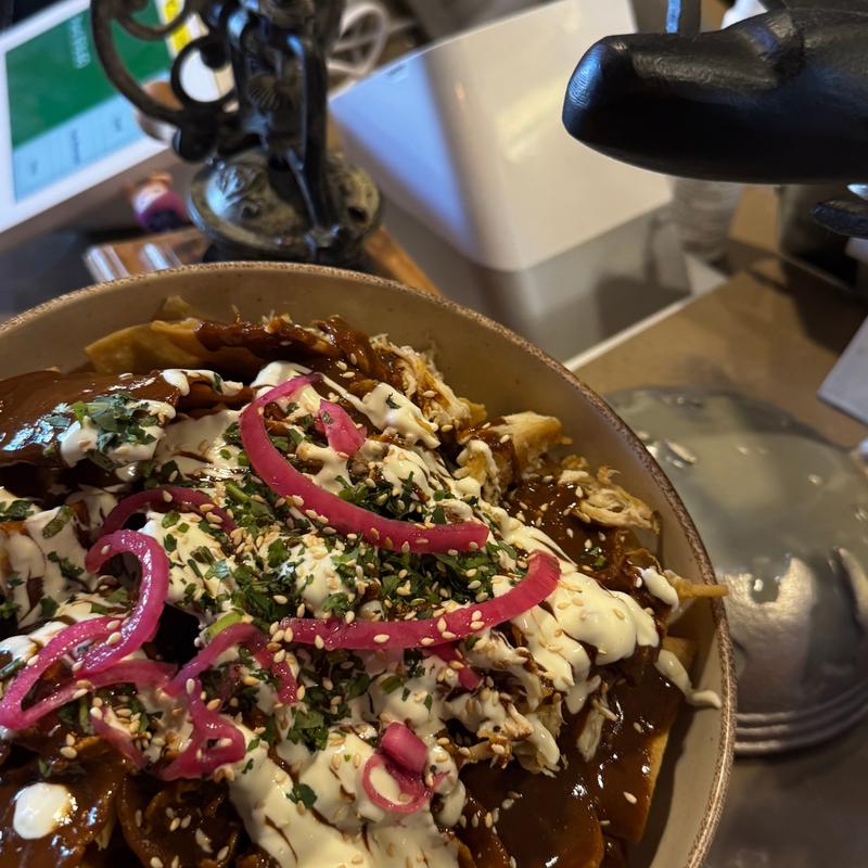 Fresh corn tortilla chilaquiles with chicken mole, sour cream, red onion, queso fresco, sesame seeds, and cilantro.