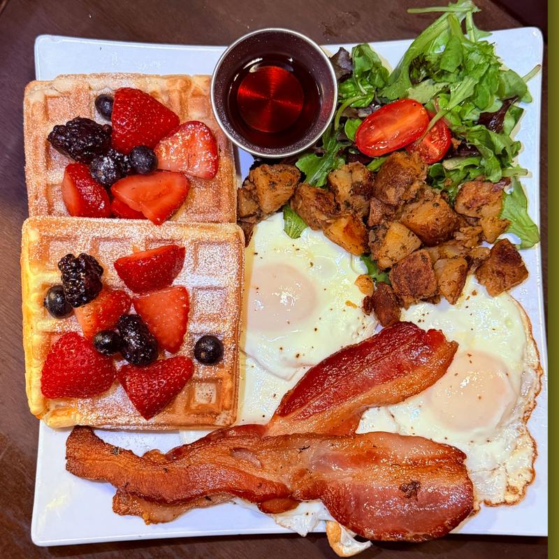Two Belgian waffles with fresh fruit, three eggs any style, your choice of protein, plus home potatoes and a green salad.